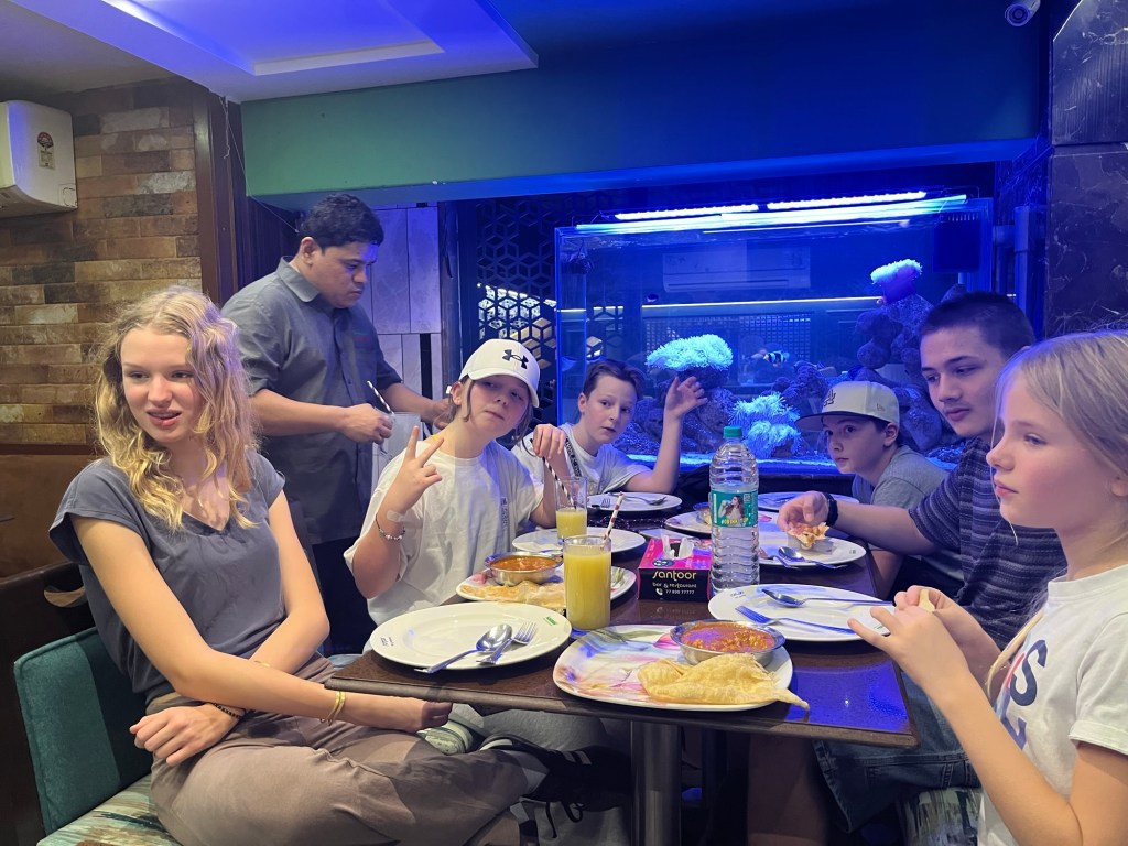 Between sun cream and seawater showers, we apply the Indian mosquito cream Odomos, which still smells the same, and then get the children together again for dinner in the restaurant.