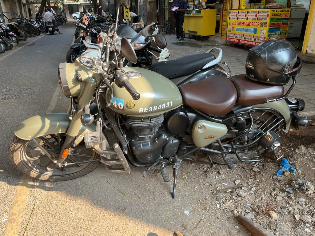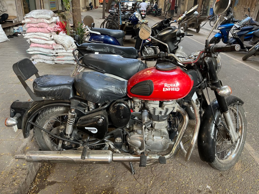 Wenn man vergessen hat, wie es ist, in Indien mit einem Motorroller durch die Gegend zu fahren, dann erinnert man sich schnell wieder an das Hupen, wenn sich jemand nähert, an die Kühe auf der Fahrbahn, an die kurvenreiche Strecke mit überraschenden Schlaglöchern Und an die inzwischen erstaunliche Präsenz von SUVs, die dann kaum noch alleine durch die kleinen Gassen passen, geschweige denn, wenn sich zwei begegnen. Und natürlich immer noch ab und zu Polizisten mit langen Holzstöcken, die willkürlich Fahrer herausziehen und zur Kasse bitten. Auf dem Weg nach Süden, am Strand entlang heute Morgen suchte ich vergeblich nach der Stelle, an der früher die Overland Trucks standen – jene Wagemutigen, die mit ihren eigenen Fahrzeugen aus Deutschland hierher kamen. Vielleicht gibt es sie noch, aber leider haben sie keinen freien Platz mehr am Strand, der ganze Strand ist mit Strandbuden und Hütten bedeckt, von denen die meisten schon doppelstöckig sind. Meistens sind es Inder, die dort wohnen, anscheinend nette Familien mit ihren Kindern aus der Mittelschicht, die jetzt auch ihren wohlverdienten Jahresurlaub genießen. Aber es gibt sie auch noch, die Original-Goa-Reisenden mit ihren knatternden Enfield Bullets mit den großen Gepäckträgern, langhaarigen, wild aussehenden Fahrern und Frauen mit dunklen Locken als Begleiterinnen, beide im Ethno-Look, den man früher Goa nannte, die einen zu mehreren hintereinander mit lautem Knattern überholen. Bald, so hoffe ich, kann ich wieder mitspielen, wenn ich mir in Anjuna auch eine Enfield ausgeliehen habe. Aber zum Üben ist der Roller genau das Richtige, immer die Armbanduhr an der linken Hand zur Erinnerung im Zweifelsfall dorthin, denn es ist Linksverkehr in Indien.