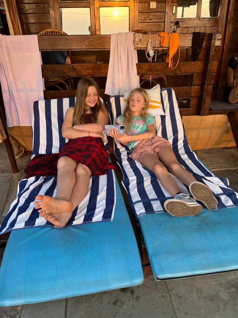 The children’s most important activity is the wave board and the question of who gets to use the boards, which are always in short supply. I’m slowly getting back into a routine with Nadine: after a morning walk on the beach, we go for a swim before meeting up to write, read or go to one of the beach cafés.