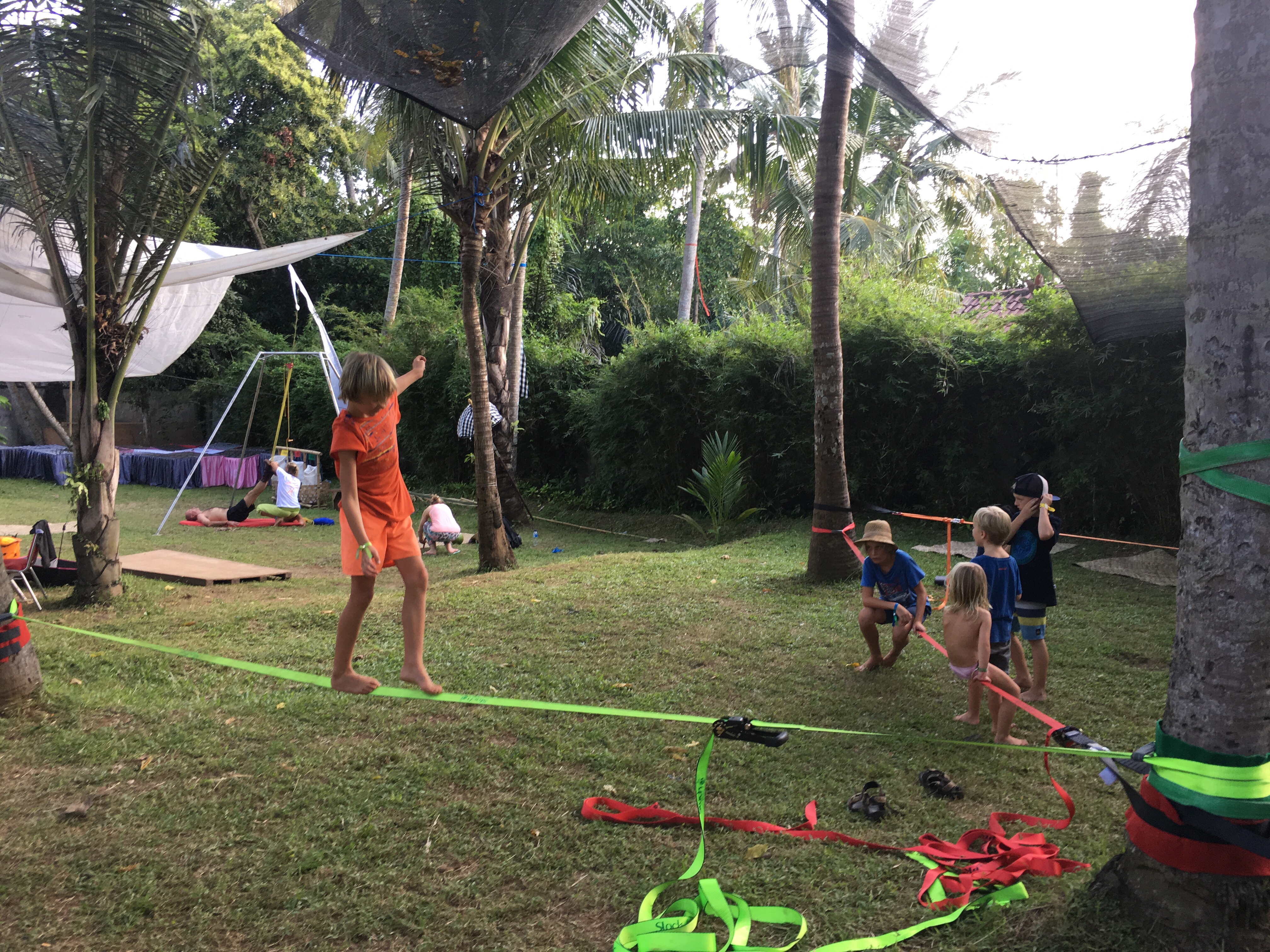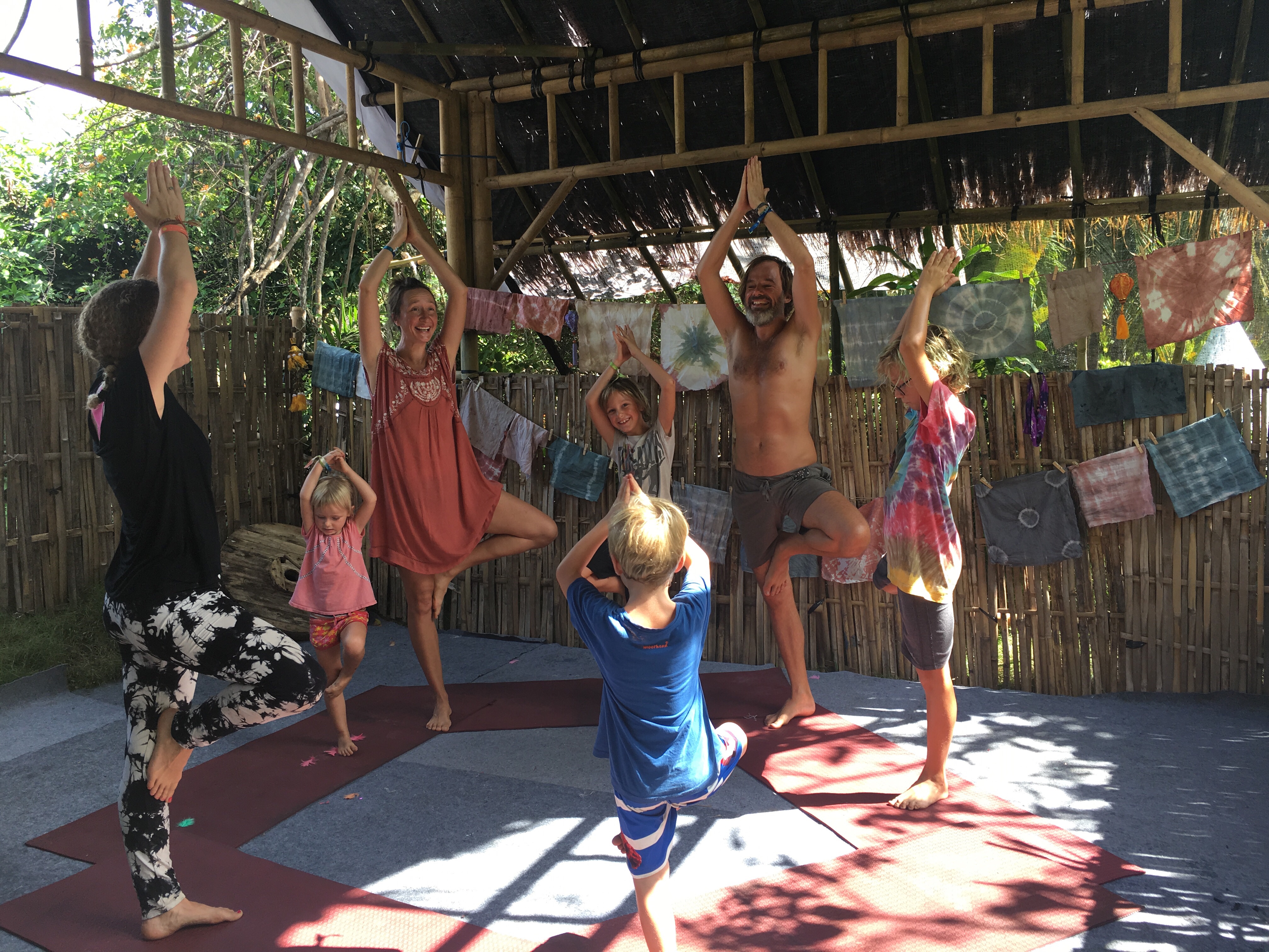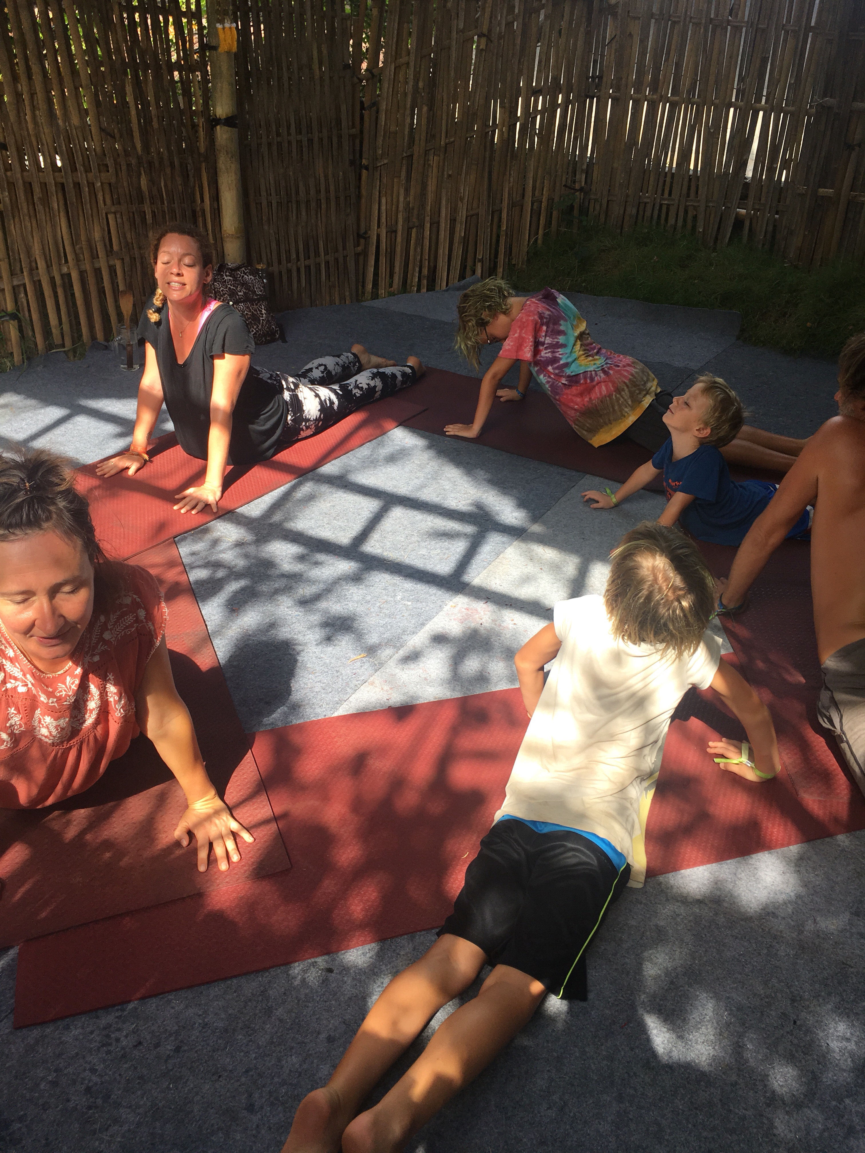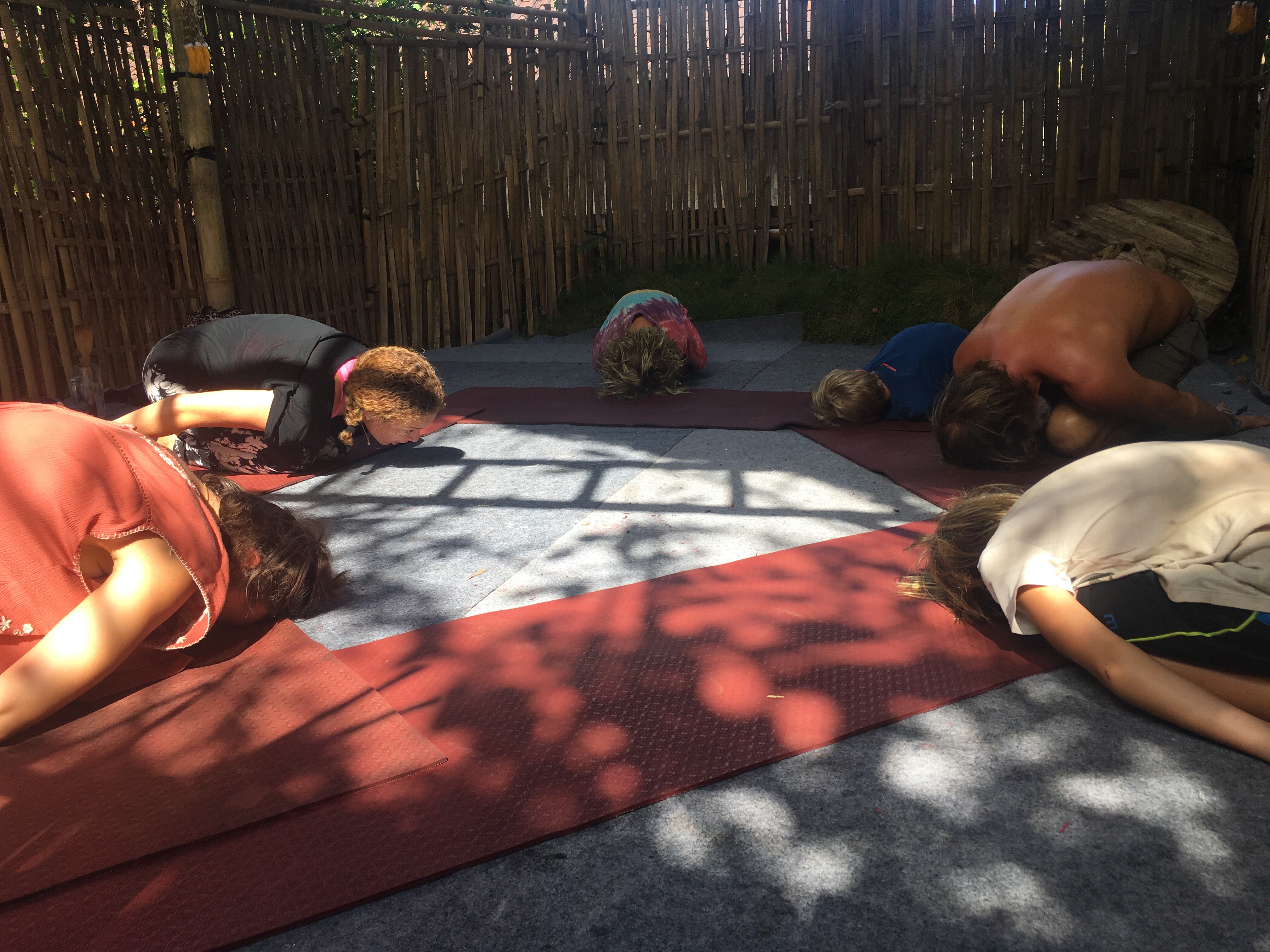 Heute sind wir richtig angekommen: Lysi bekam das verlorene Bändchen ersetzt, und wir sind alle gleich um 9.30 Uhr beim Yoga mit Lisa aus Holland für die ganze Familie gelandet. Das war toll: